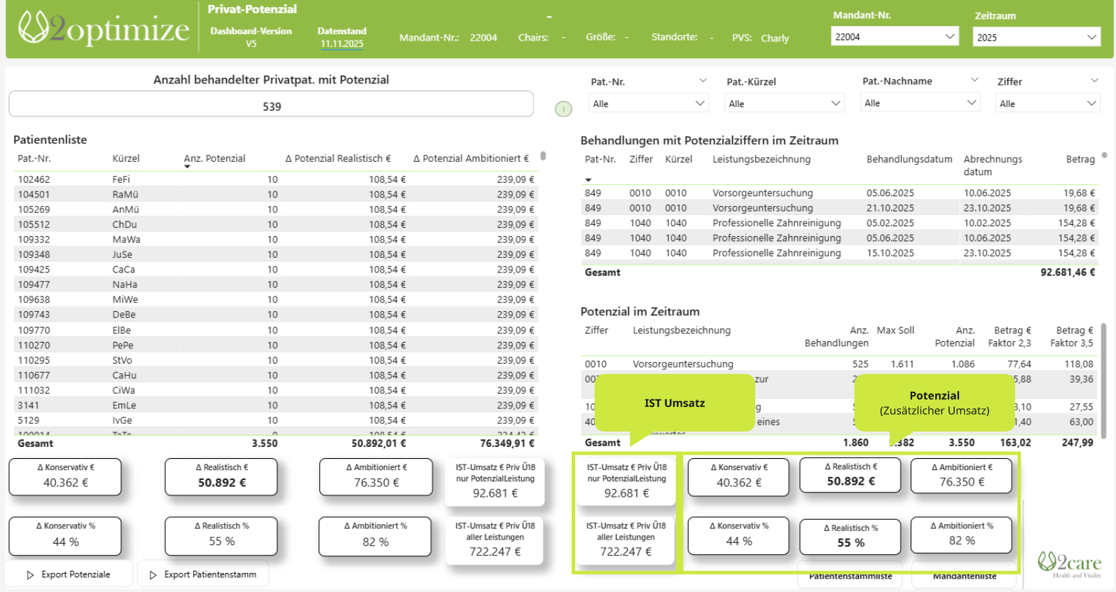 U2optimize wertet die historischen Daten dieser Patienten aus und identifiziert potenzielle Behandlungsleistungen, die im Rahmen des anstehenden Besuchs sinnvoll ergänzt werden können.